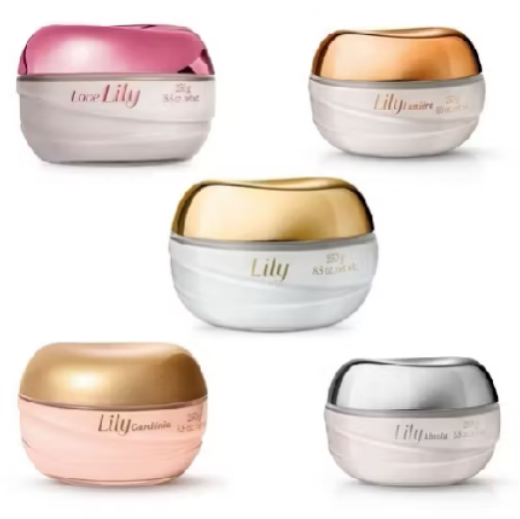 O Creme Hidratante Acetinado Lily oferece uma textura macia e fragrâncias variadas para cuidar do corpo com toque suave e confortável.